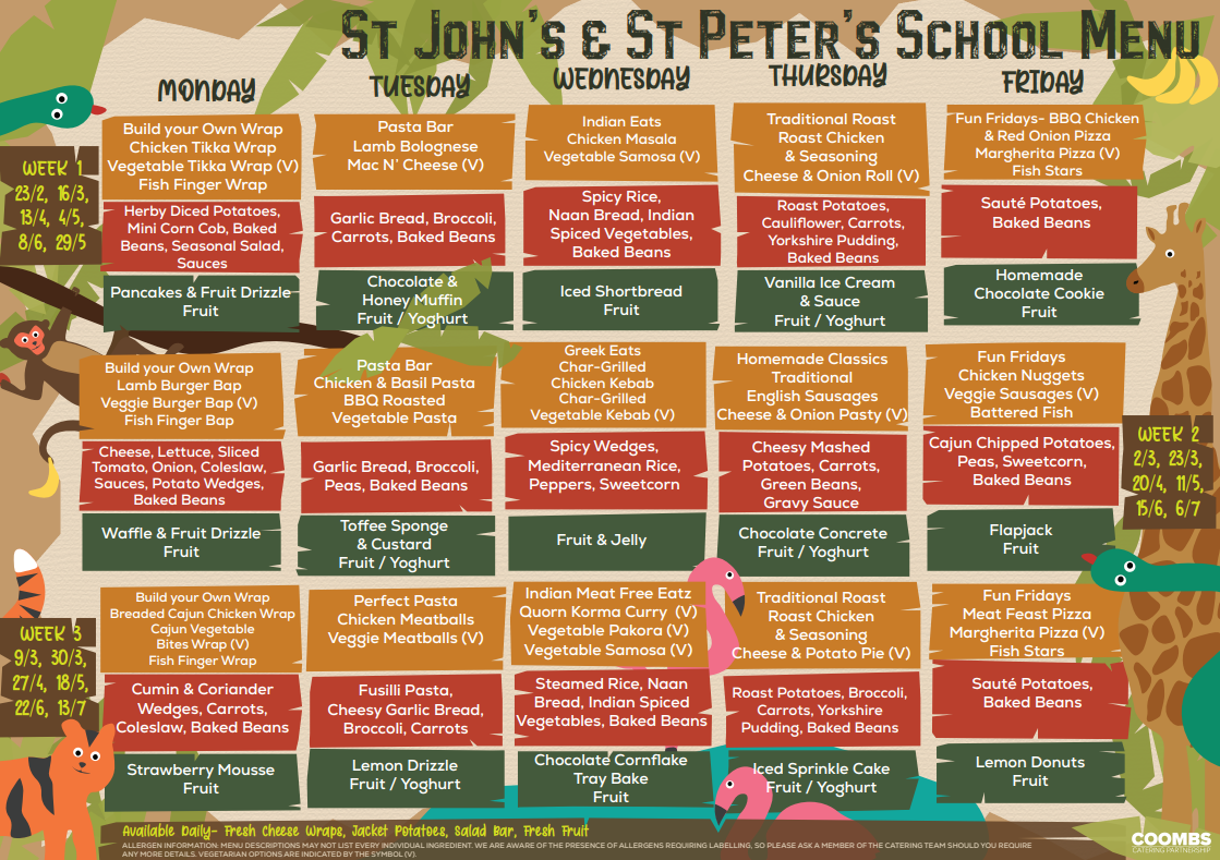 Our school dinners are provided in house by Coombs Catering Partnership. Our wonderful team of chefs cook up a delicious menu each week - take a look below!